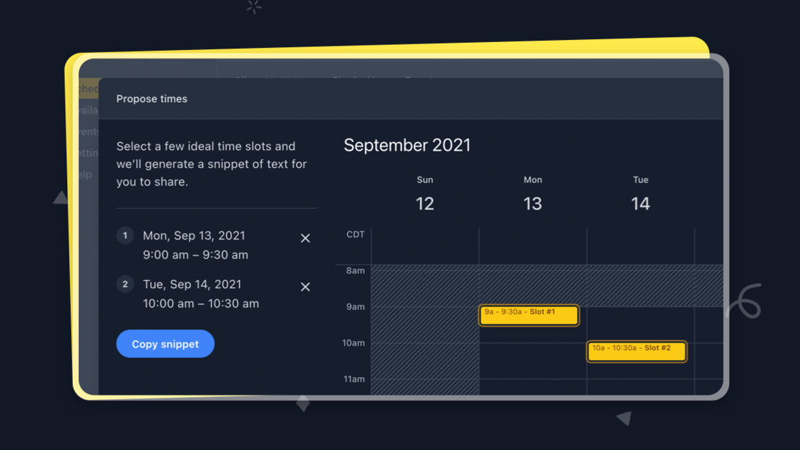 Instead of playing email tag, you can send over a personalized SavvyCal calendar link to find a new time. You can even select a few ideal time slots to include directly in the email.
