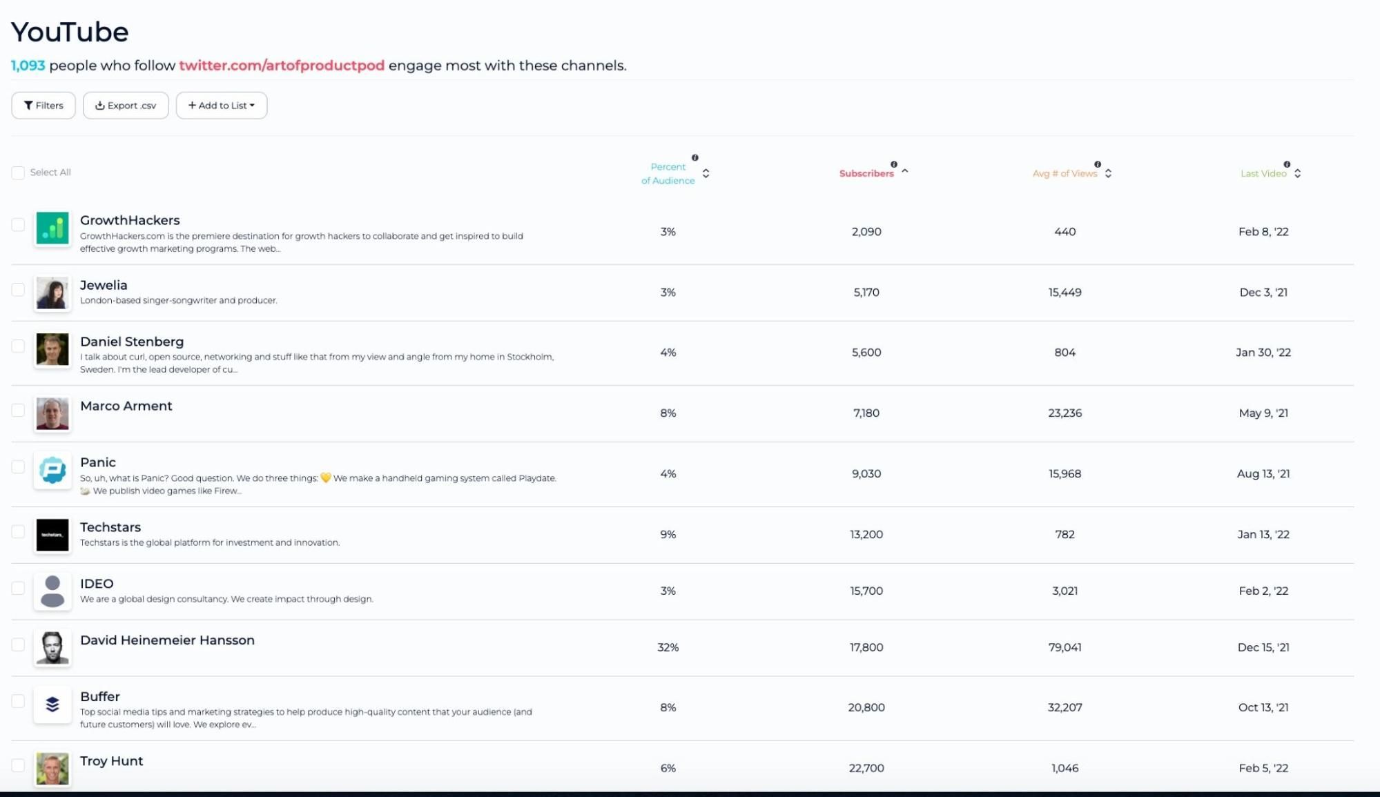 Another tip is to also search for the Youtubers your followers engage with in SparkToro.