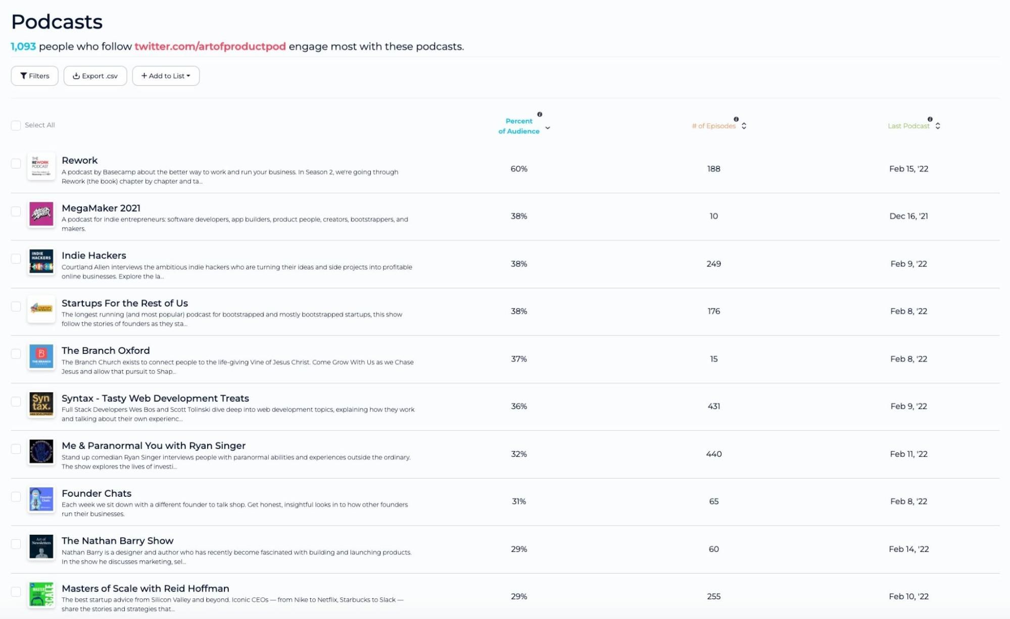 Pro Tip: Exporting this podcast to a Google Sheet or Excel file and then filtering this podcast list by the highest percentage of the audience as well as the fewest number of episodes can be a great way to find up-and-comers in your niche.