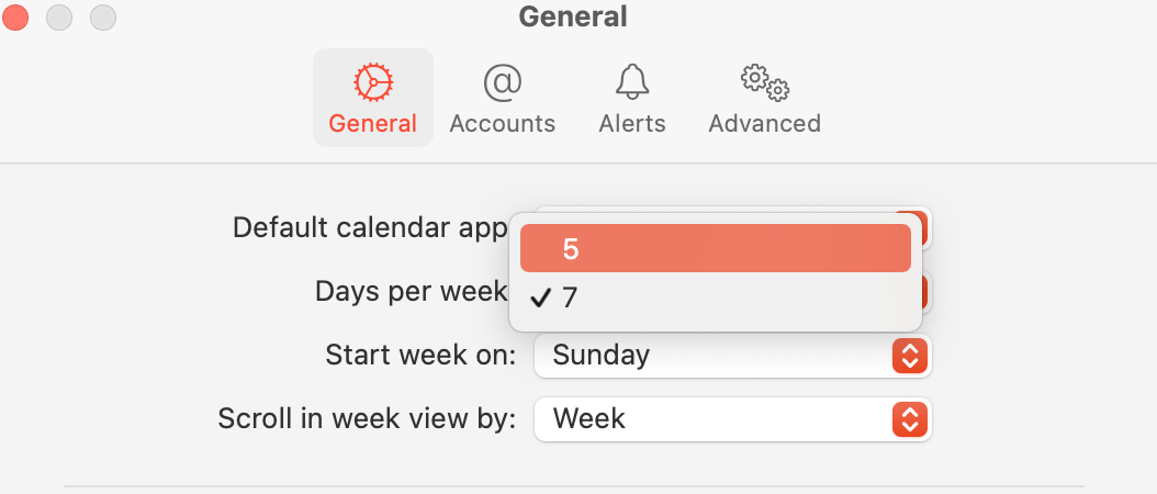 You can change how many days of the week you see and the day your week starts on by making selections under the general tab.
