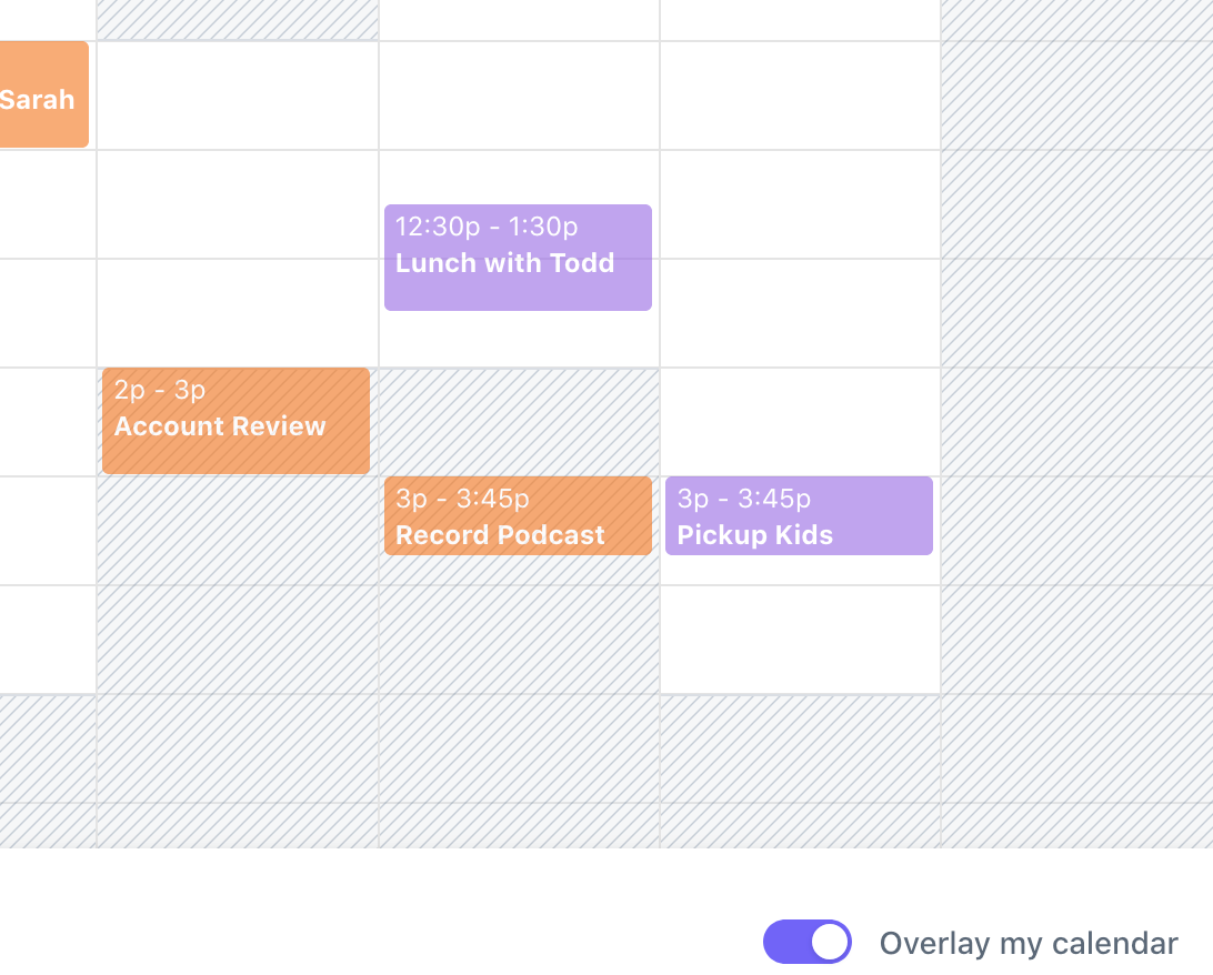 Using SavvyCal with your Apple calendar allows you to create and send personalized invite links, overlay calendars to find mutual availability, and gives recipients the ability to book as little or as much time as they need.