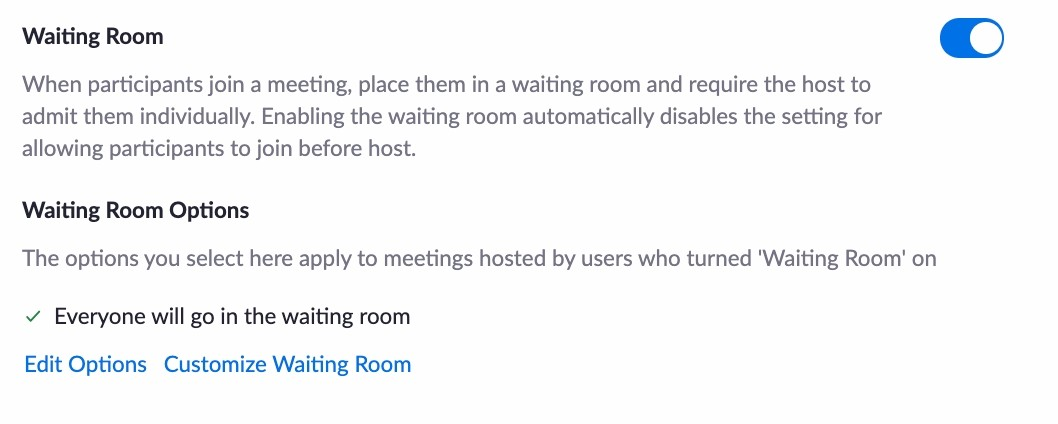 This brings us to our next time. Use Zoom’s waiting room feature so that the meeting host stays in control and can decide whether to admit people one at a time or all at once.