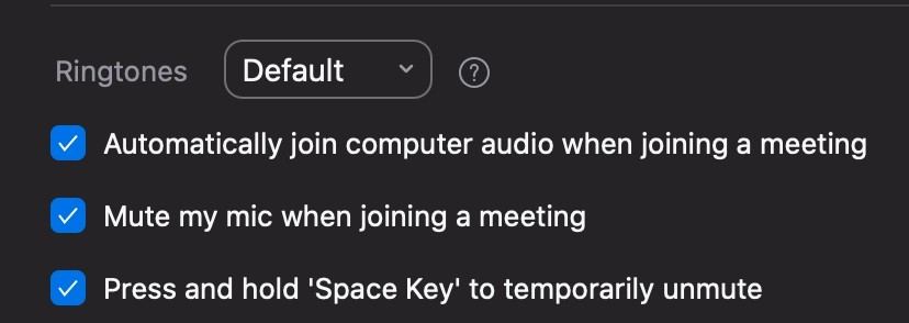 This means setting the default to mute on mic whenever anyone joins the calls. In addition, instead of hitting the mute button, you can use the space bar as a keyboard shortcut to mute/unmute yourself quickly.