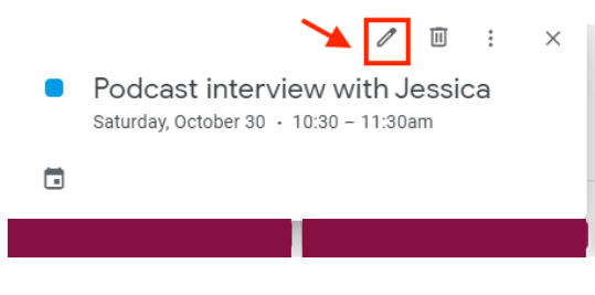 Next, click the edit event icon (i.e. the pencil icon) in the new window showing the event details.