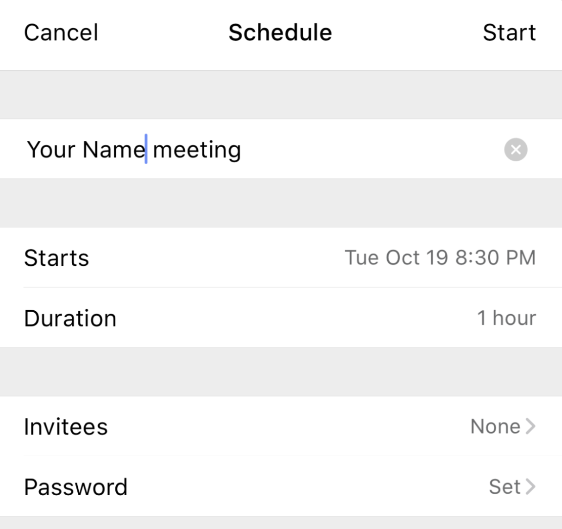 Then, you can add your meeting details on the Schedule page, including meeting name, duration, date and time, etc.