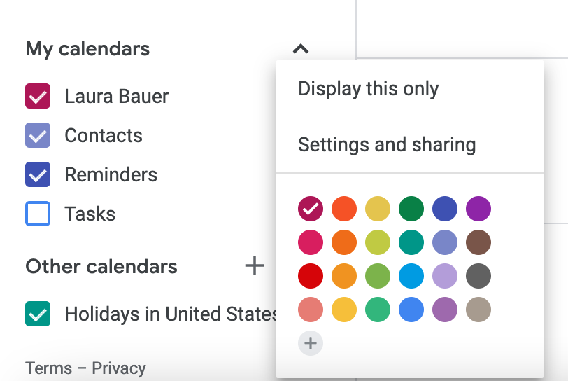 Change the color of a specific calendar: Click the 3-dot menu across from the calendar you wish to change and select a color.