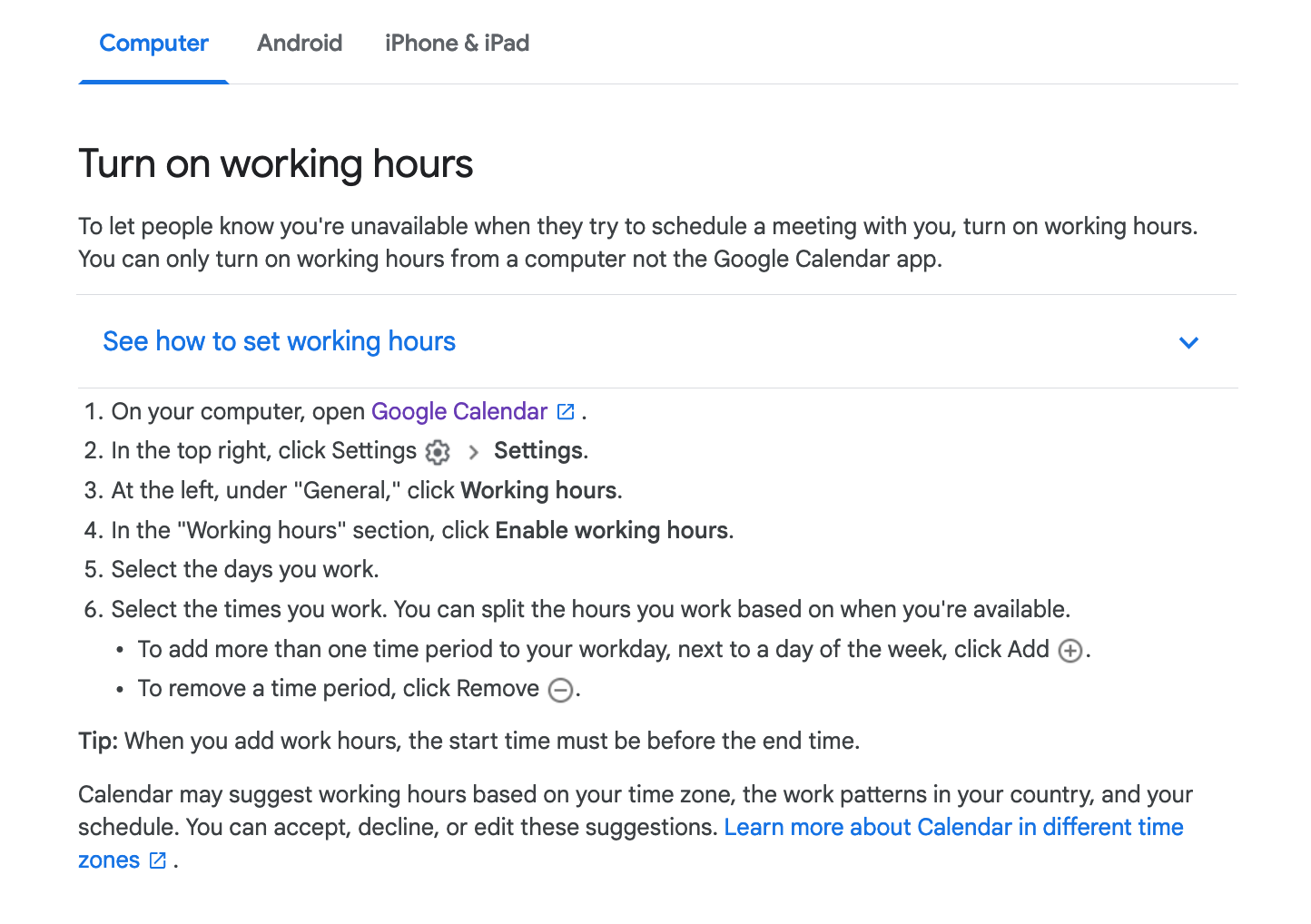 Making a scheduling error isn’t difficult with so many teams spread across different time zones and on asynchronous work schedules. But turning on Google Calendar’s world clock and enabling your working hours (plus encouraging your teammates to do so) can mitigate many of those issues.