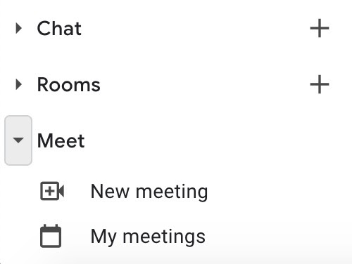 In the bottom left hand corner of your inbox, you’ll see three options: Chat, Rooms, and Meet. Click on Meet to schedule a new meeting or see your current meetings.