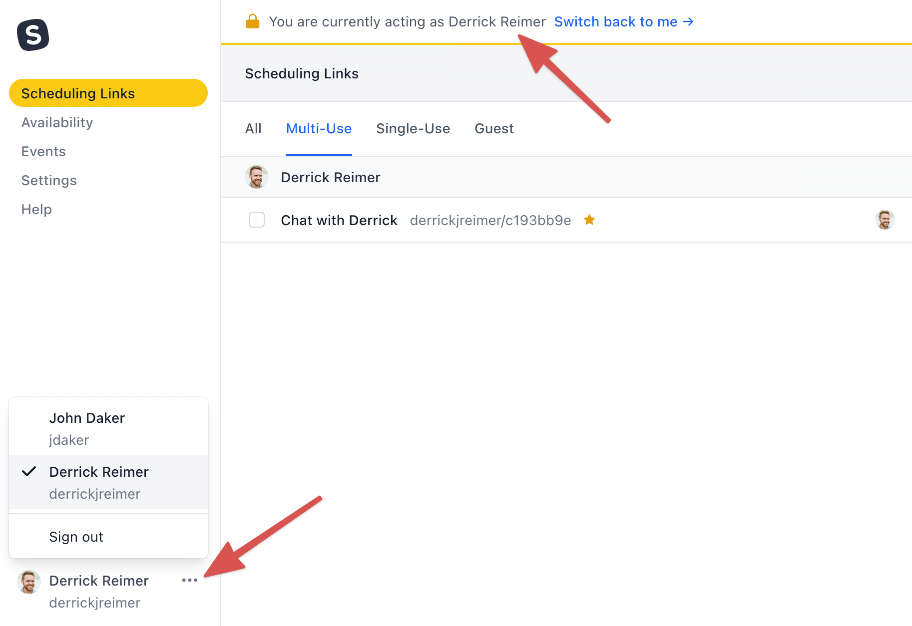 Once your assistant has a SavvyCal account, you can grant them access to your calendar. They’ll be able to toggle back and forth between your calendar and their own and can manage your scheduling links, availability, basic account settings, and billing details.