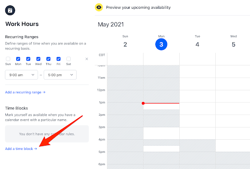 To do this, go to SavvyCal’s availability settings and select Add a time block: