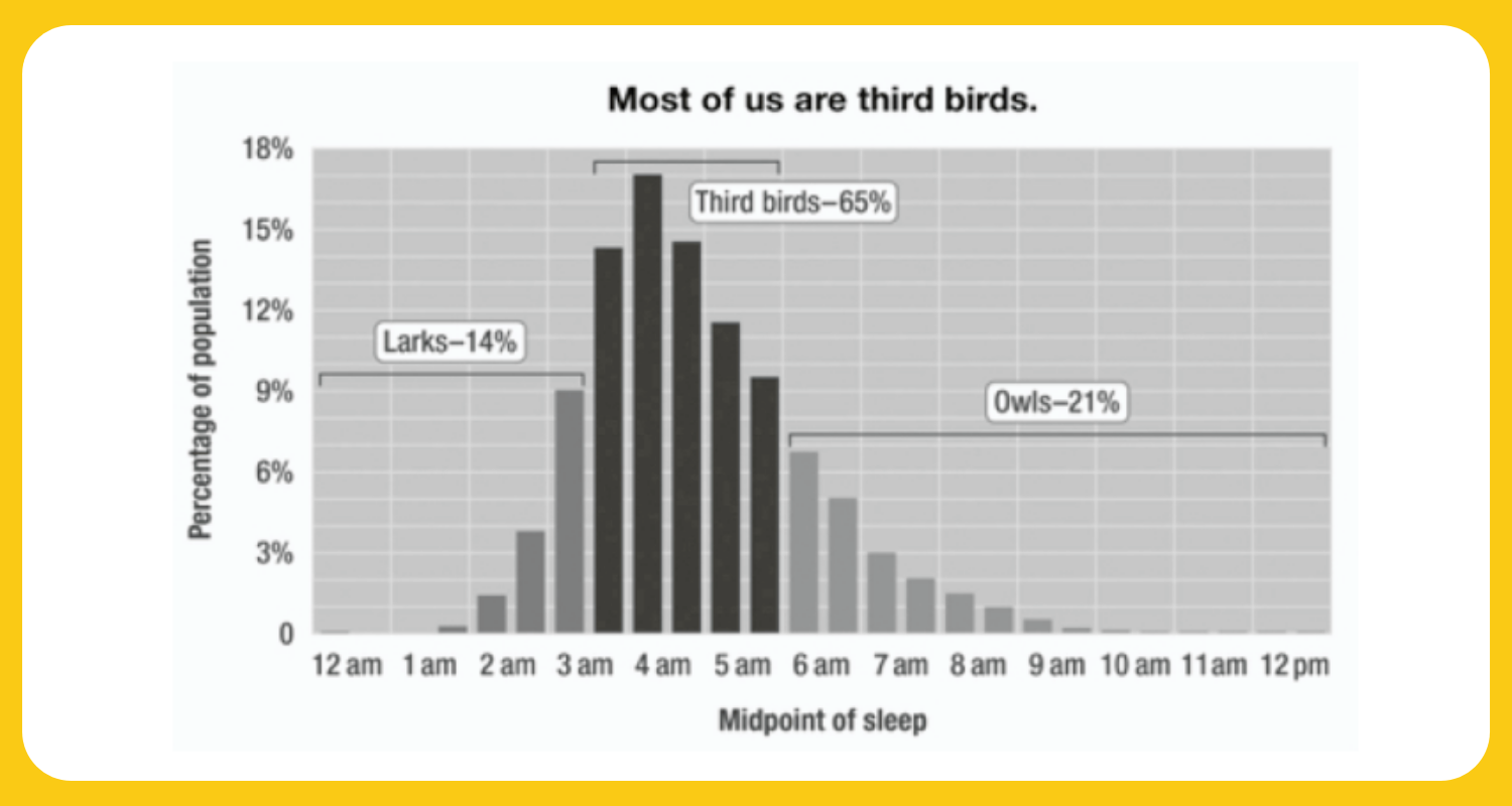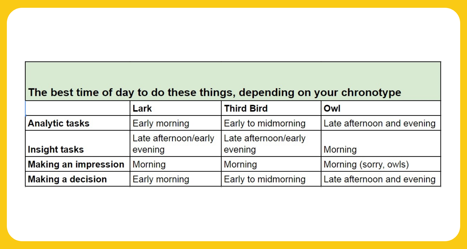 Step 1: Figure out your chronotype: Determine whether you’re a lark, an owl, or a third bird to see which parts of the day are your peak, trough, and rebound periods.