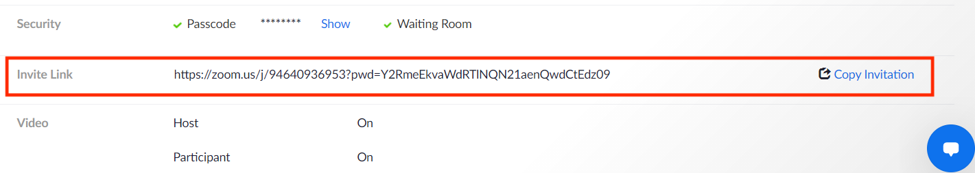 Then, you'll go to the meeting you scheduled. About halfway down the page, you'll see the invite button link. You can select “copy invitation.” Then, you can copy the meeting link or send an email invite, which includes the call-in phone details to the person you are inviting to your Zoom call.