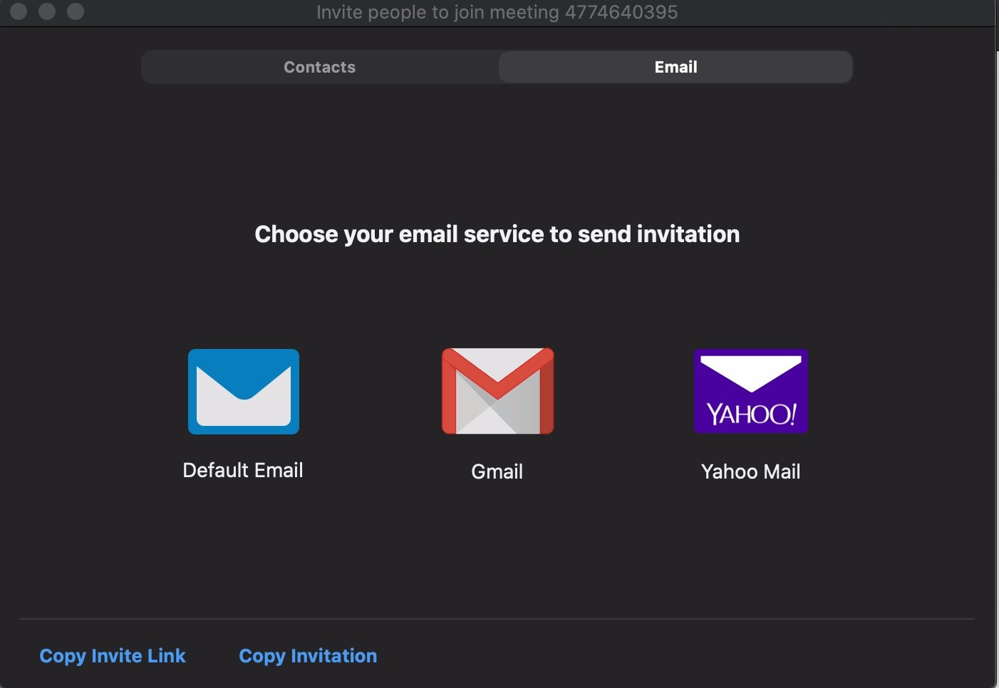 Another way is to click on the “email tab.” Then, you can automatically email the Zoom invitation link details via default email, Gmail/Google Suite, or Yahoo Mail.