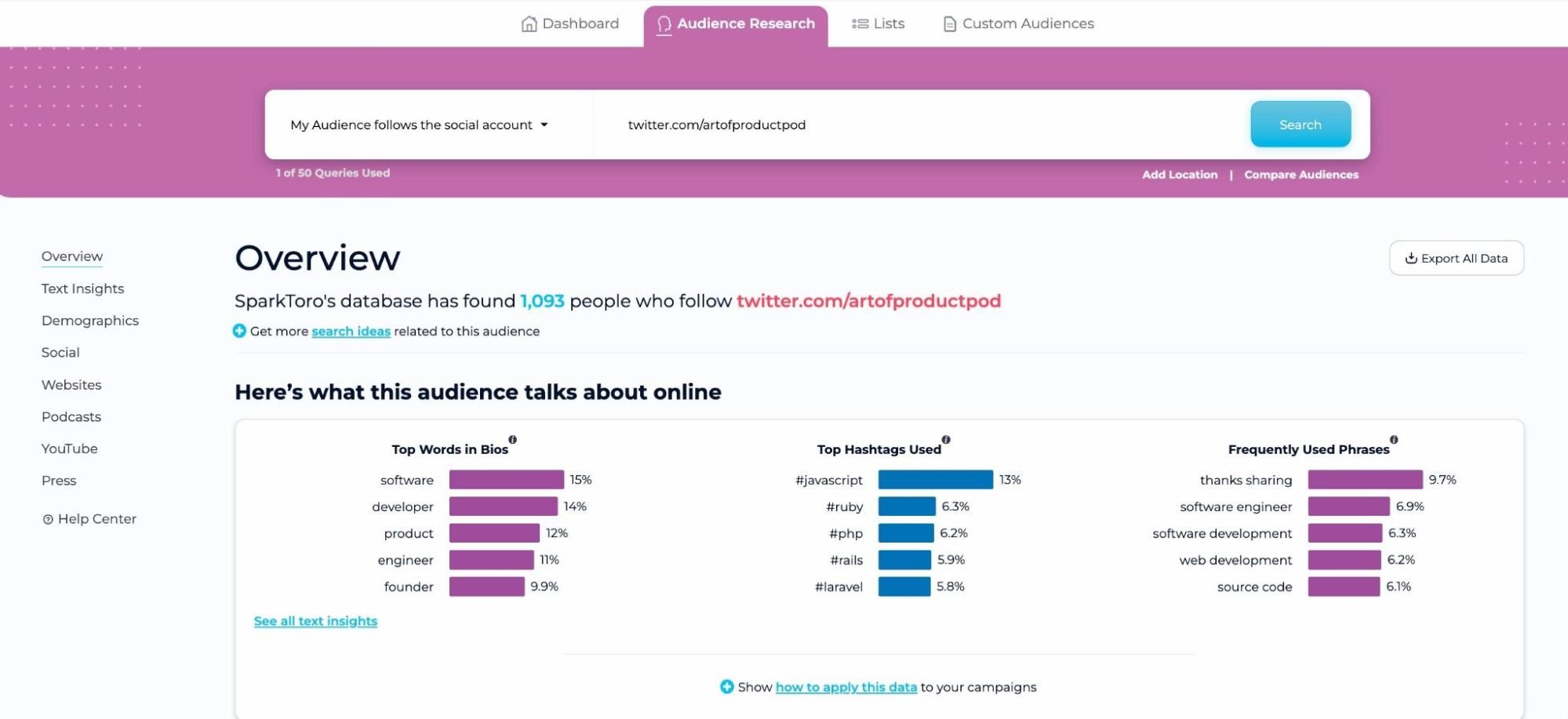 For instance, I searched for The Art of Product podcast on SparkToro. The overview screen gives some interesting insights into the people who follow this podcast (in this particular instance, their Twitter account), including the top phrases, hashtags, and words used in bios.