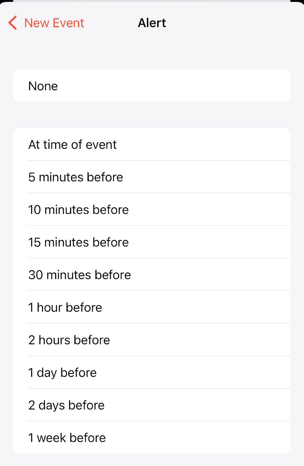When you create an event in Apple Calendar, there’s an option called ‘Alert.’ You have 11 options to choose from, ranging from 1 Week Before to At the Time of the Event. You can also choose not to receive a notification.