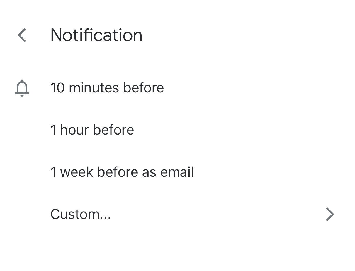 The Google Calendar app also allows you to set an alert for each event you create using the Add a Notification option. For example, you can select from 1 Week Before as an Email to 10 minutes Before the event or a custom option.