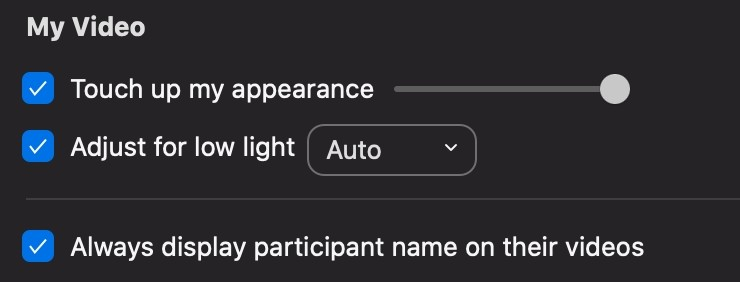 Pro Tip: If your home office is in a basement or you are in a place with poor lighting, you can use Zoom’s virtual background feature or the advanced video features (see image below) in the Zoom Preferences Tab in a bind.