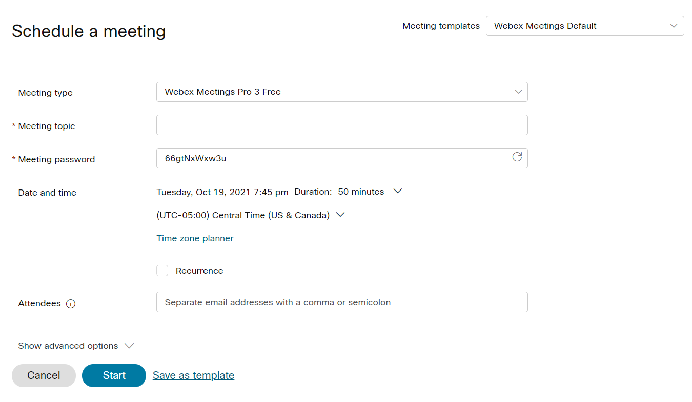 If you’d like to customize your meeting further, select the show advanced options text. This lets you do the following: