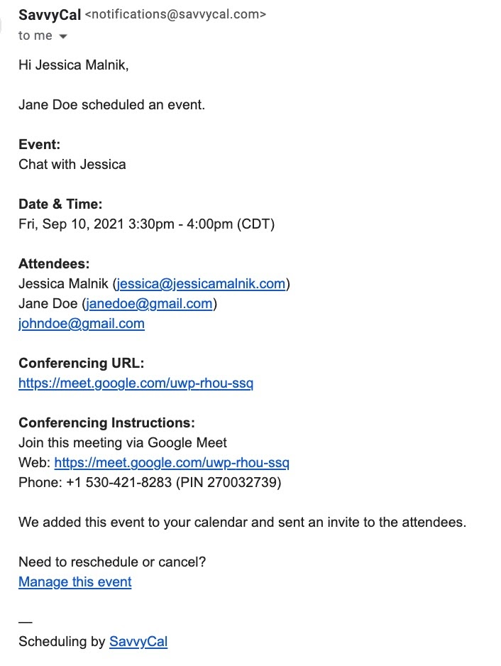 Then, when someone goes to book a time with you, SavvyCal will automatically create a scheduled Google Meet call link.