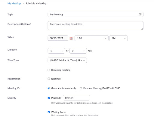 Then, you can add your meeting details, including topic, description, dates/times, timezone, etc.
