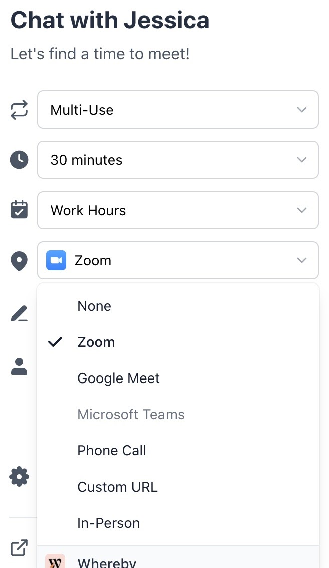 Once Zoom is installed, Zoom will automatically show up as “a location” option on all of your scheduling links.