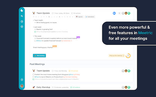 Meetric works directly with your Google Calendar or Google Meet and allows you to take notes without switching windows. Easily capture meeting minutes, take notes, and assign tasks to yourself and others in the meeting. This extension also has a built-in timer to help you keep meetings on track.