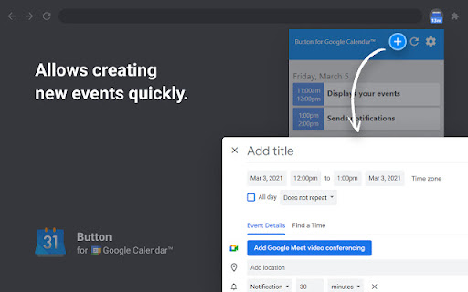 You can quickly enter a Google Calendar event from Chrome, preview your schedule in the extension, and search and add Google Contacts from Chrome.