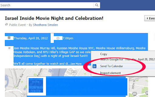 Now you can send events to Google Calendar automatically from any webpage without re-typing! Select text, right click, and ‘Send to Calendar.’ It works great with Facebook or any other website. Select the text that has the event information you want to schedule, right click and choose ‘Send to Calendar.’